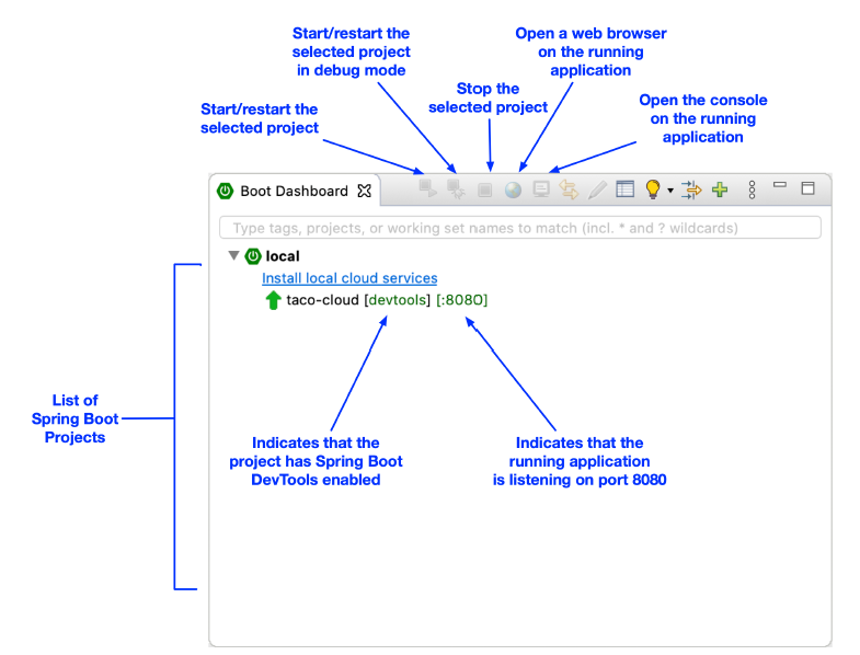 Tôi sẽ không dành nhiều thời gian để nói hết mọi chức năng của Spring Boot Dashboard, mặc dù hình 1.7 đã nêu ra một vài chi tiết hữu ích nhất. Điều quan trọng cần biết lúc này là cách sử dụng nó để chạy ứng dụng Taco Cloud. Hãy đảm bảo ứng dụng taco-cloud được chọn trong danh sách các dự án (nó là ứng dụng duy nhất hiển thị trong hình 1.7), sau đó nhấn nút bắt đầu (nút ngoài cùng bên trái có biểu tượng tam giác xanh và hình vuông đỏ). Ứng dụng sẽ bắt đầu chạy.