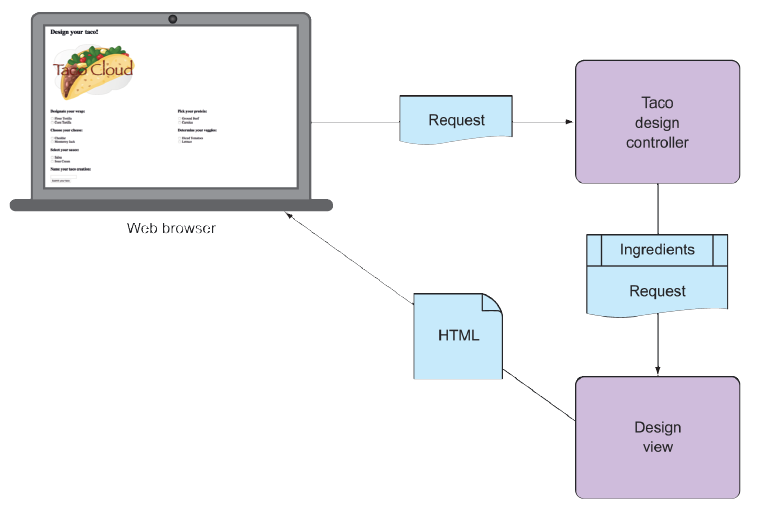 Trong một ứng dụng web Spring, công việc của controller là truy xuất và xử lý dữ liệu. Còn công việc của view là hiển thị dữ liệu đó thành HTML để hiển thị trong trình duyệt. Bạn sẽ tạo ra các thành phần sau để hỗ trợ trang tạo taco: