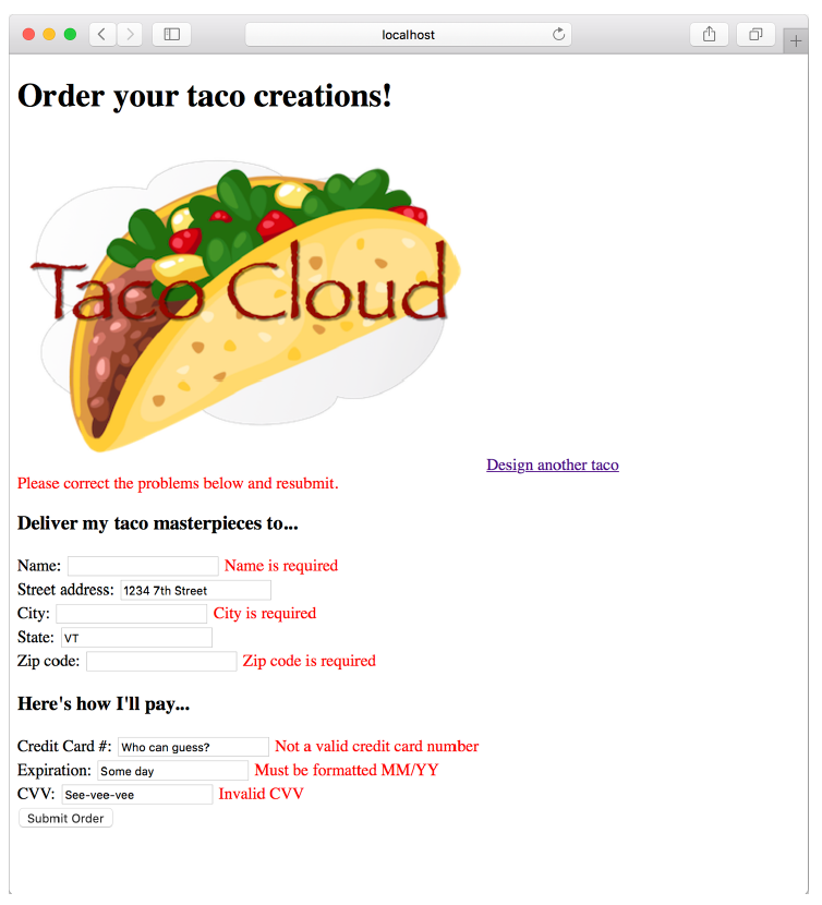 Nếu bạn chèn các thẻ <span> tương tự xung quanh biểu mẫu đặt hàng cho các trường khác, bạn có thể thấy một biểu mẫu như hình 2.5 khi bạn gửi thông tin không hợp lệ. Các lỗi hiển thị cho biết rằng các trường tên, thành phố và mã ZIP đã bị bỏ trống và tất cả các trường thanh toán không đáp ứng tiêu chí xác thực.