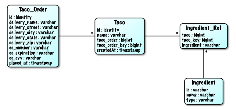 Taco_Order- Chứa thông tin chi tiết cơ bản về đơn hàngTaco- Chứa thông tin chính về thiết kế tacoIngredient_Ref- Chứa một hoặc nhiều hàng tương ứng với mỗi hàng trong bảng Taco, ánh xạ taco với các nguyên liệu cấu thành taco đóIngredient- Chứa thông tin về nguyên liệu