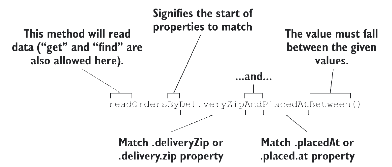String deliveryZip, Date startDate, Date endDate);Hình 3.2 minh họa cách Spring Data phân tích và hiểu phương thức readOrdersByDeliveryZipAndPlacedAtBetween() khi tạo phần triển khai repository. Như bạn thấy, động từ trong readOrdersByDeliveryZipAndPlacedAtBetween() là read. Spring Data cũng hiểu các từ khóa find, read, và get là đồng nghĩa với việc truy xuất một hoặc nhiều thực thể. Ngoài ra, bạn cũng có thể dùng count làm động từ nếu muốn phương thức trả về một số nguyên đại diện cho số lượng thực thể khớp.
